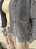 Features: Dropped shoulders, defined seaming, side pockets, open-front style, ribbed knit detailing, elbow patching