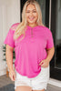 Unleash your playful side with the On A Whim Pink Raw Hem Henley Tee! Made with brushed microfiber for ultimate comfort, this tee features a scoop neck, drop shoulder, functional buttons, and exposed seams. The scooped hem adds a touch of whimsy. With the comfort of the brushed microfiber, you'll be ready to any whimsical scenario!