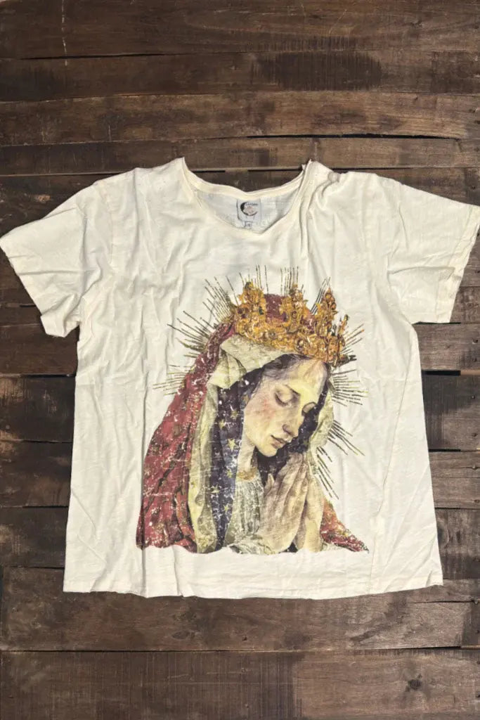Get ready to shine in the Maria Blessings Moon Dance T-Shirt by Jaded Gypsy. Made from 100% premium cotton for all-day comfort, this tee features a respectful Blessed Virgin Mary graphic and signature distressing on the shoulders for that cool, worn-in look. Its breezy A-line cut offers flattering movement, while the exclusive Jaded Gypsy brand stamp on the back adds an elevated look. Experience the magic of a mother's love with this great graphic T.